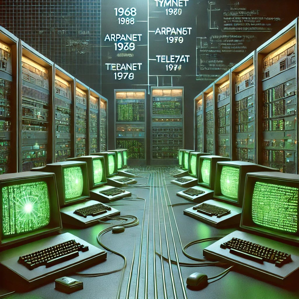 Tymnet went live with production traffic in late 1968, a full year before the first ARPANET nodes came online. By November 1971, the network had reached 50 operational nodes with an international footprint. Tymnet’s management then decided to commercialize the network, officially opening it to third-party connections and paying customers in February 1972—a full 20 years before the Internet’s commercialization at MAE-East in 1992. While the MAE-East contract was signed in late 1992, actual traffic-bearing connections began appearing in early 1993.